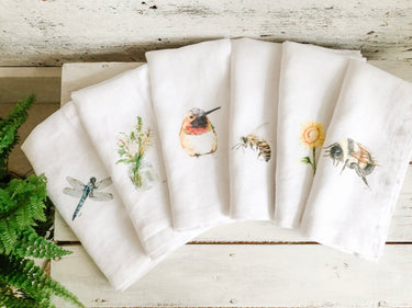 Set of six French Linen napkins with dragonfly, flowers, hummingbird, bees and sunflower