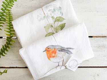 Blue Hydrangea and English Robin French Linen Tea Towel Set of 2